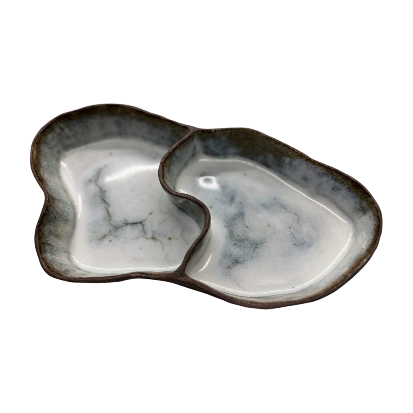 "This striking hand-built serving dish features a beautifully organic, biomorphic shape divided into two distinct compartments. Perfect for serving coordinated pairings—like olive oil and balsamic, spices and dipping salts, or dual sauces—it brings a sculptural element to your table.