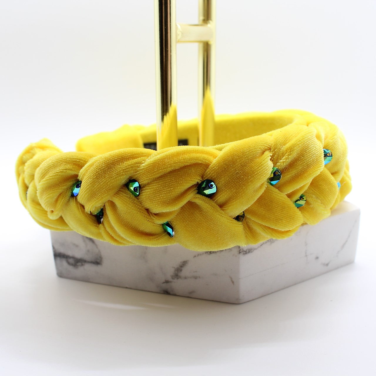 Our luxury line of headband is here to add to your shine. This Peacock Braided Velvet and Rhinestones Headband is accessorized with rainbow teal Rhinestones and made it an amazing choice on-trend, chic headband perfect for a day to evening look.